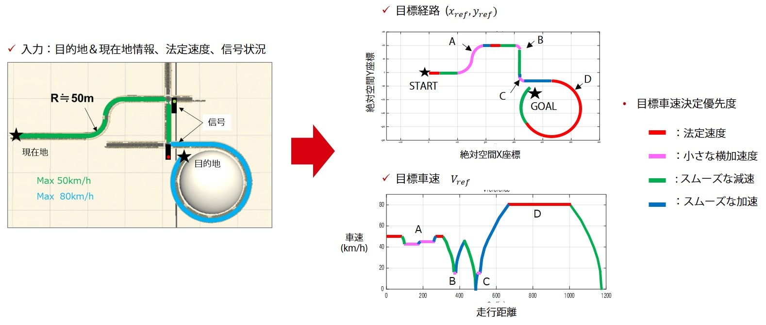 日常的な場面で自動運転に求められるのは、ドライバーや乗員から「安心で滑らか・気持ち良い」と感じてもらえることです。前後左右に大きな加速度を出さず交通信号・法定速度を遵守しながらも、メリハリのあるスピードコントロールが必要です。まさしく、「熟練ドライバーがさまざまなシーンで発揮する運転技量を、クルマ自身が再現すること」が求められるのです。