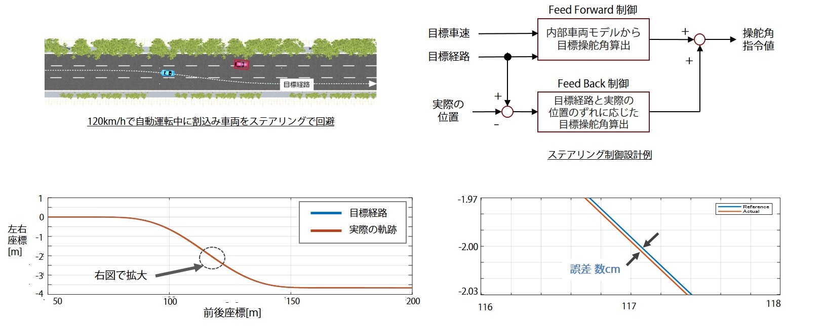 自動運転ならば、ステアリングの制御は多くのセンサーから自車の位置や角度情報を読み取り、それらに基づいて操作量を決めると思われがちですが、実際は異なります。特に高速走行時は目標経路と実際のずれを検出して操作量を決めるFeed Back制御だけでは軌跡の修正は間に合いません。目標経路・車速と同時に操作量も決定するFeed Forward制御が必須です。ステアリング操作に対する車両ダイナミクスを正しく理解して設計すれば、目標経路との誤差数cm以内で走行することが可能となるのです。