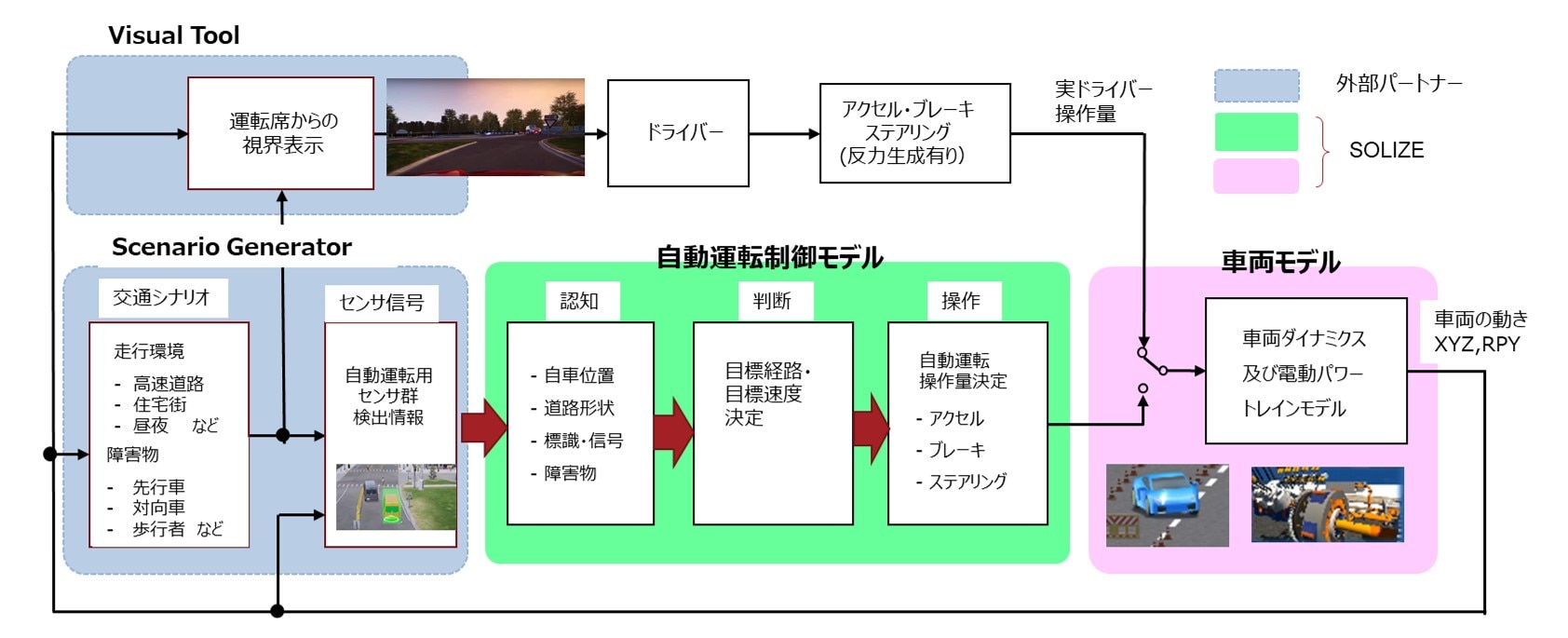 自動運転の本質は突き詰めると、①外界状況を正確に認識する、②認識した状況に基づき自車の目標経路と車速を決定する、③目標経路・目標車速を忠実に実現する、の3つです。このうち②や③は、SOLIZEの持つビークルダイナミクスや電動パワートレインの技術が基盤となる領域です。SOLIZEは、これまでに培った技術を自動運転シミュレーションへと発展させます。