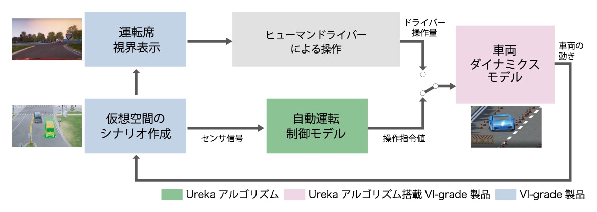 Urekaは、自動運転性能を車両レベルで評価できる「自動運転シミュレータ」を2021年に導入し、自動運転制御アルゴリズムの開発を進めてきました。自動運転シミュレータには、交通シナリオ生成ソフトウェア「VI-WorldSim」、リアルタイムコンピュータ「AutoHawk」をはじめとするVI-gradeの製品群を採用しました。ドライビングシミュレータ分野で実績のある同社の技術を活用することで、目標経路・目標車速の算出や、それを実現するステアリング・アクセル・ブレーキの各操作量の決定といった、自動運転の要となる制御アルゴリズムを効率よく作ることを実現しています。