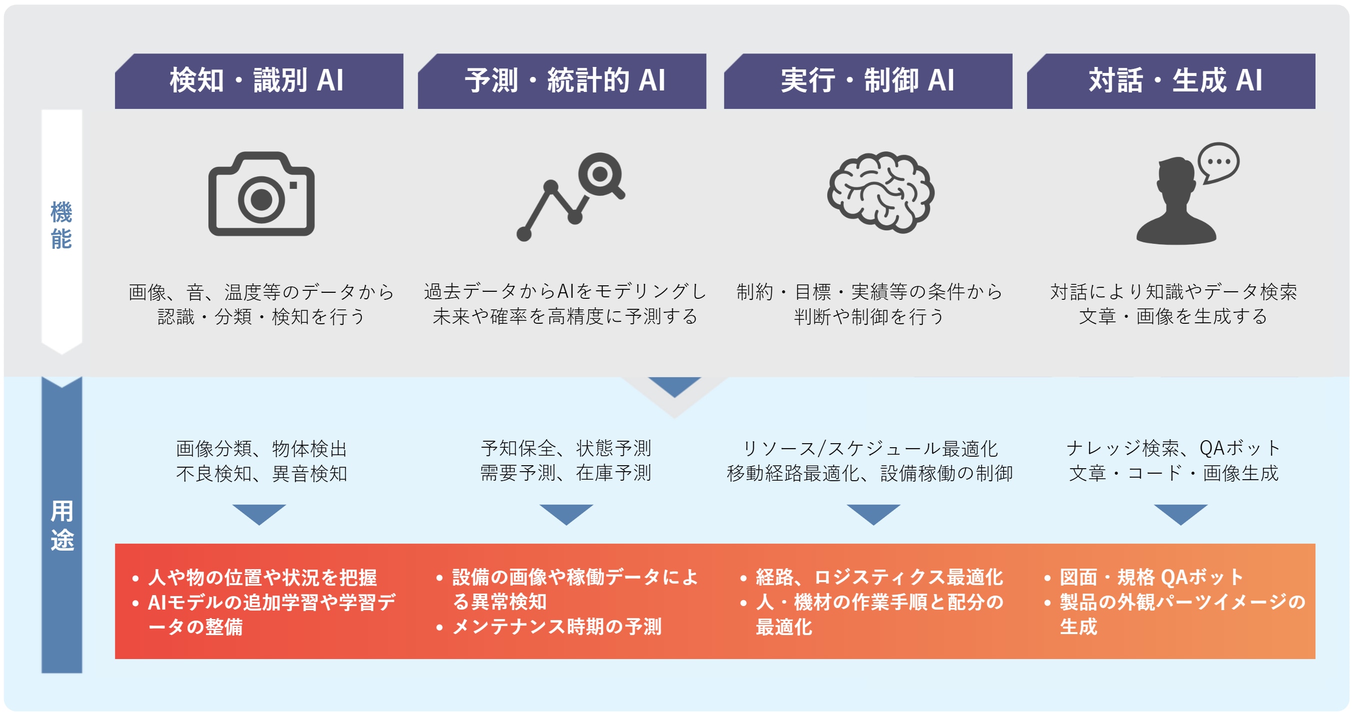 画像や音などの検知・識別、それらのデータも用いた異常の検出や将来の予測、ベテランのスキルをモデル化し自動化を推進する実行・制御 AIや生成AIまで、