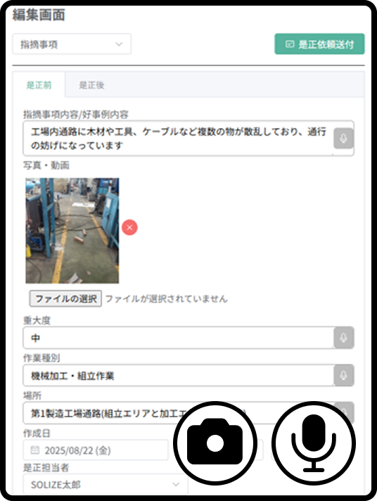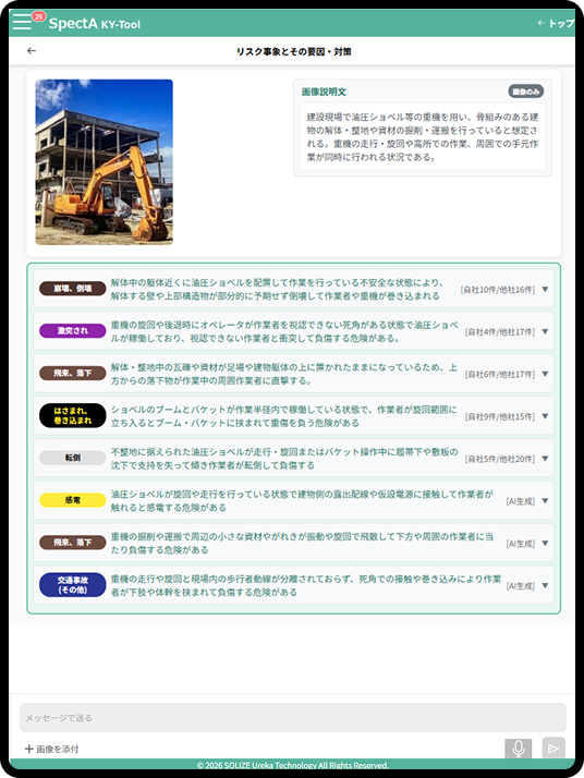 撮影した写真をAIが自動解析し、「想定されるリスク」「過去の類似事例」を候補として表示。